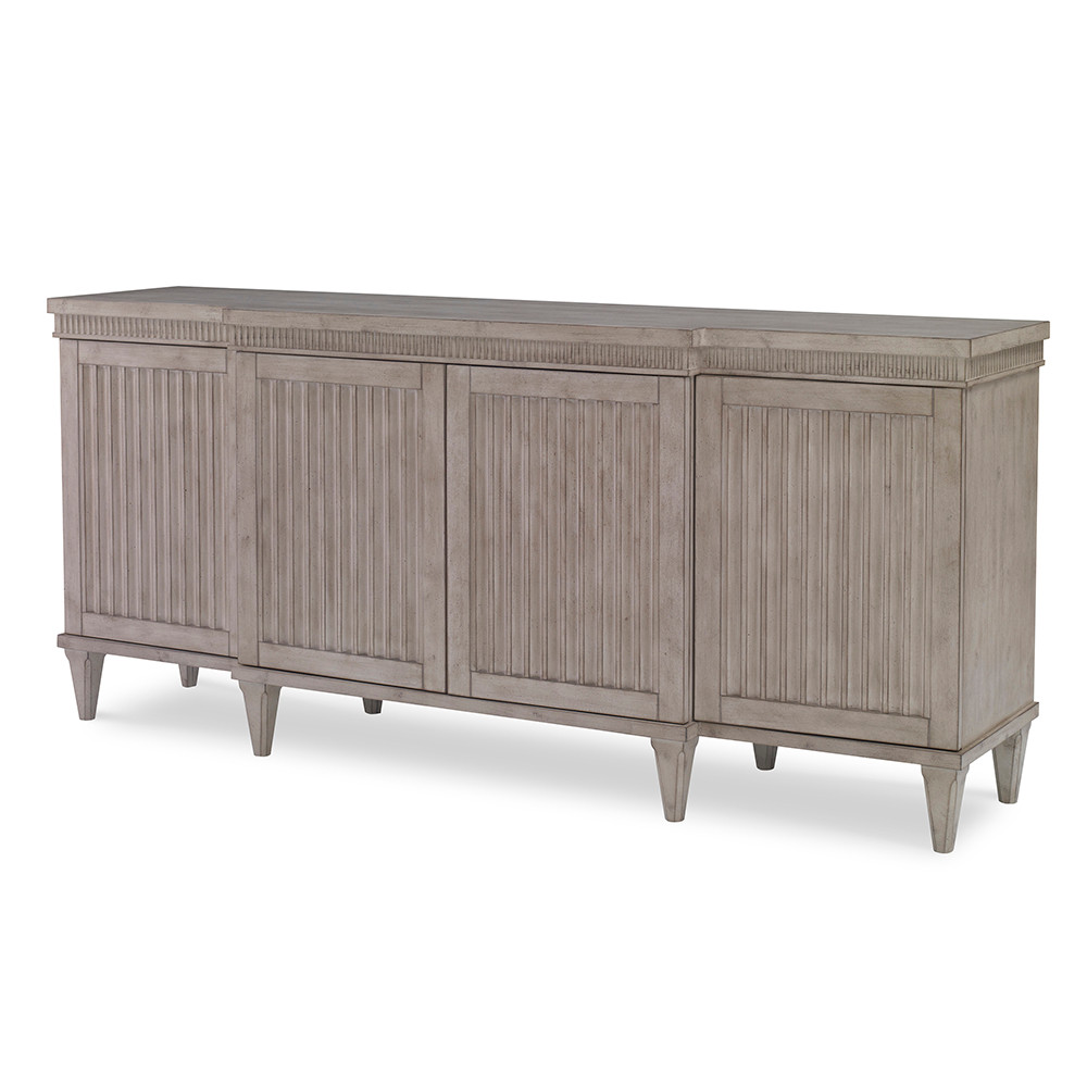 Enjoy the Bourdin Multi-Use Cabinet in your home today! Fluted doors and a fluted apron add character to this French inspired multi-use cabinet. The cabinet's breakfront shape includes four doors all raised on tapered legs. Mahogany solids and veneer. Finished in bisque.