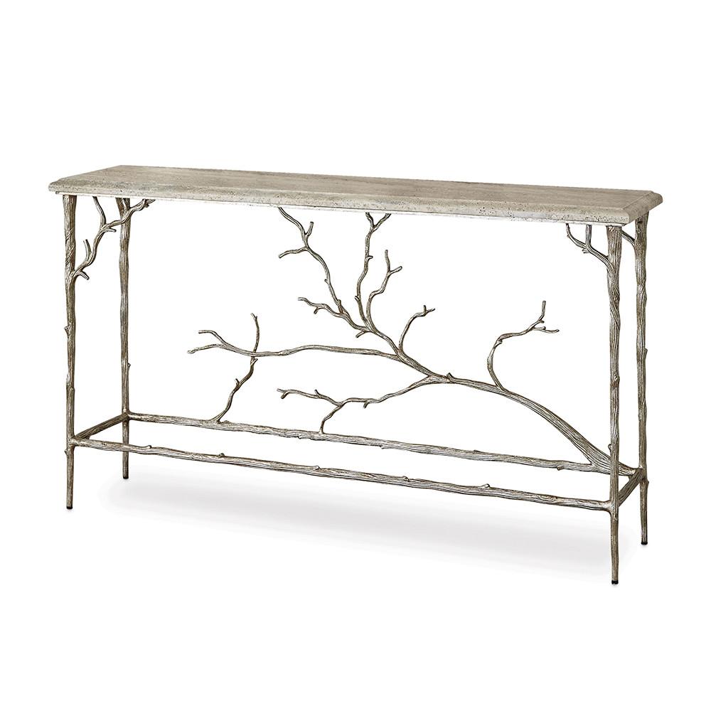 Enjoy the Branch Console in your home today! Cast aluminum table has a silver metal leaf finish with golden and green highlights. Top is made of Italian silver Travertine and has a honeycomb steel core that reduces weight and improves strength.