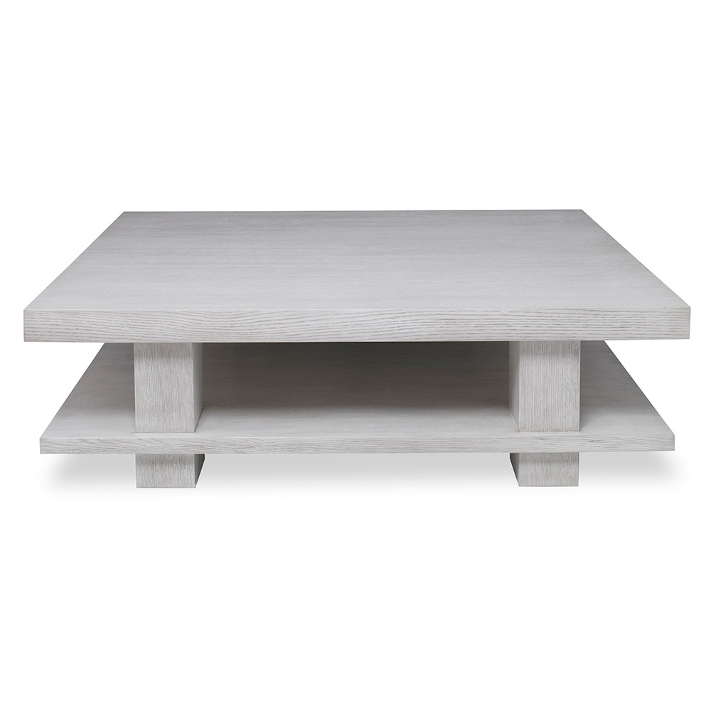 Enjoy the Braque Square Cocktail Table - Weathered in your home today! Crafted from White Oak solids and veneer, this large cocktail table features a slab top raised over a shelf with four overscaled legs. Finished in weathered ivory.
