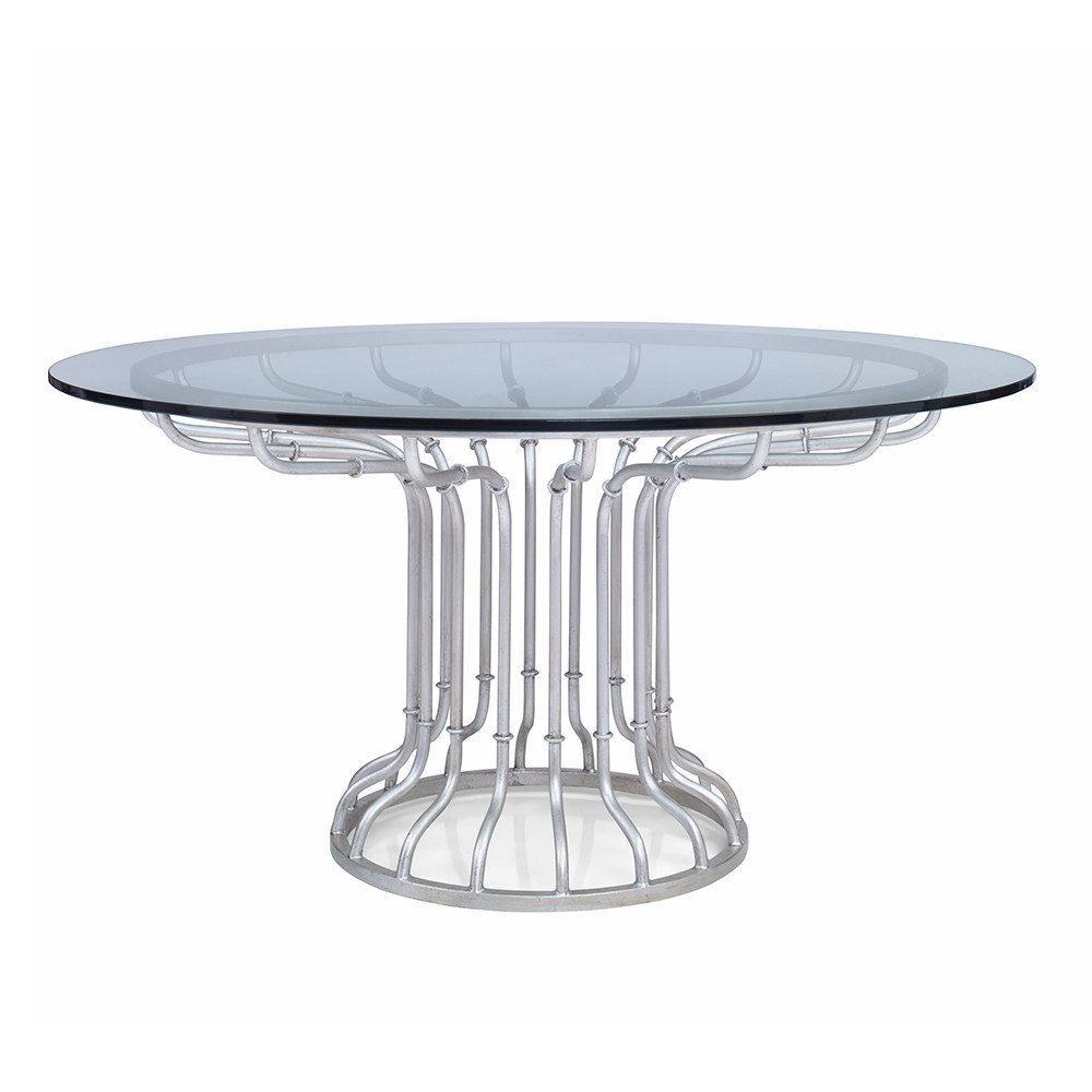 Enjoy the Café Dining Table in your home today! This metal flared table base is reminiscent of Parisian tables of the early 1900s. The antiqued silver leaf base supports a 5/8" thick clear glass top.