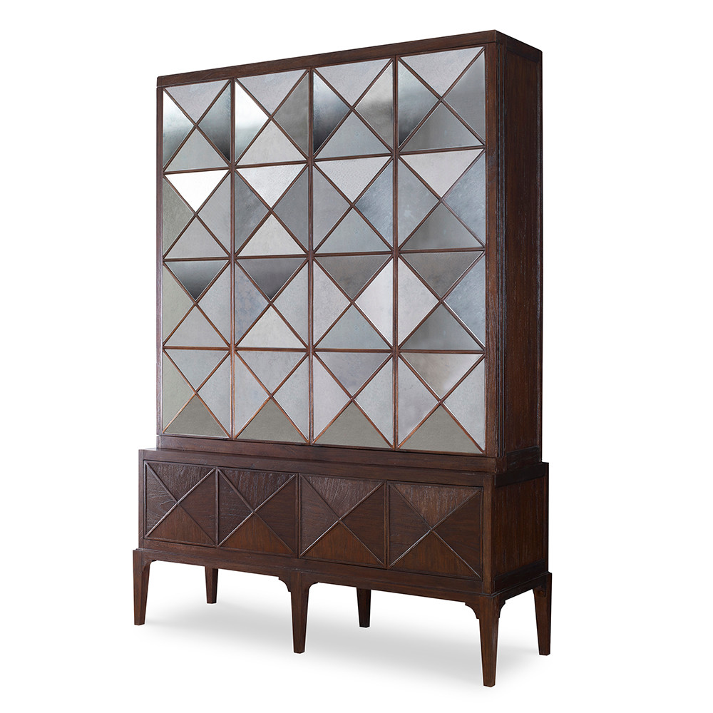 Enjoy the Escher Multi-Use Cabinet - Dark Finish in your home today! Crafted of solid Mindi wood and veneer with a rich brown finish. The dimensional pyramid bi-fold doors are covered in antique mirrors on the upper section. The base stands on tall legs and has four wooden pyramid dimensional doors. Top has two adjustable shelves to accommodate many sizes of electronics. Both top and bottom have chase and grommets to allow easy wire access. Cabinet will hold up to a 60'' flat screen TV.