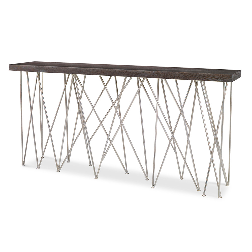 Enjoy the Haystack Console Table in your home today! A multitude of random silver leafed rods create the base for this console table. Straight grain Oak top.