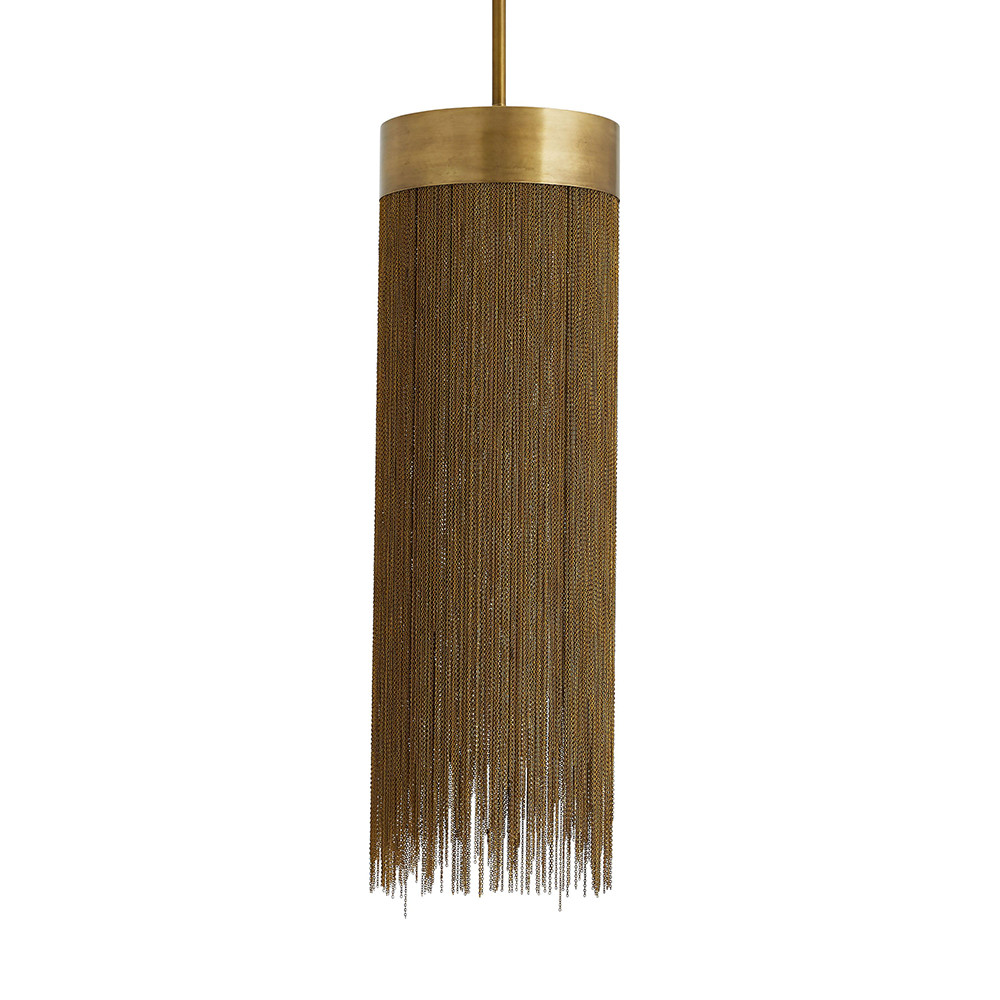 Enjoy the Fatima Pendant in your home today! A design derivative of some of our most favored sconces this pendant exudes Hollywood Regency style. Artistically dangling from a thick brass band are rows of delicate antique brass chains that are almost jewelry-esque. When in use this piece notonly adds light and luster to a space its tassel-like design gently breaks up the light to create subtle shadowplay. finish will vary. Additional pipe available (PIPE-452) Damp-rated, although limited covered outdoor conditions may affect finish.