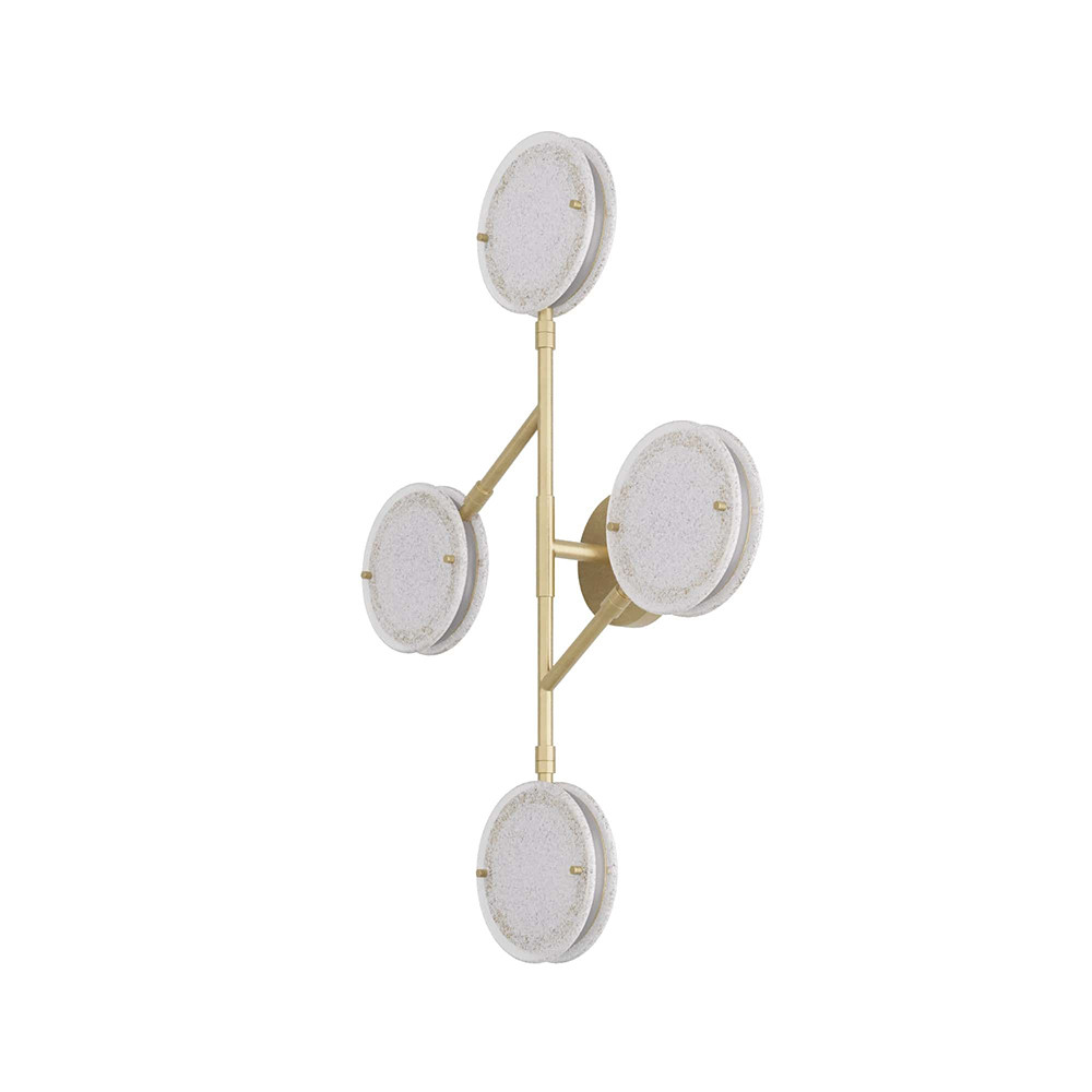 Enjoy the Meridian Sconce in your home today! The Meridian sconce finds modern design inspiration in mobile sculptures. The linear sconce is crafted from antique brass iron and features discs of clear seedy slump glass at varying heights, each encased with an integrated LED ring. The discs pivot, altering the shape and direction of light flow when desired. Finish will vary. Damp-rated, although limited covered outdoor conditions may affect finish.