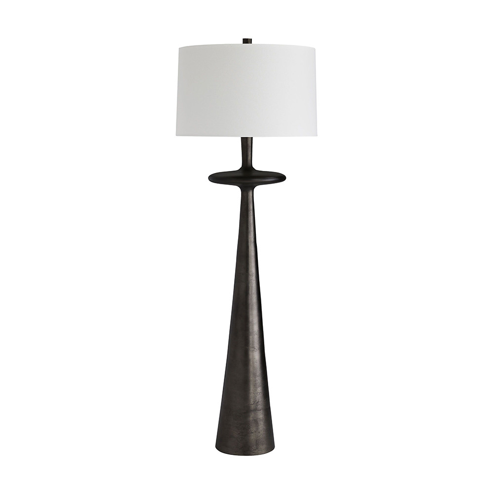 Enjoy the Putney Floor Lamp in your home today! Inspired by our Putney Lamp we created a large-scale version. From each direction its silhouette reveals three stacked rounded formsa cylinder a disk and an elongated tapered cone baseshowcasing angular composition and balance. It has a mid-century feel but the antiqued aluminum finish offers a new take on the style. Its bold form commands attention making this a great fit for a modern living area. Topped with an off-white linen shade with off-white cotton lining.