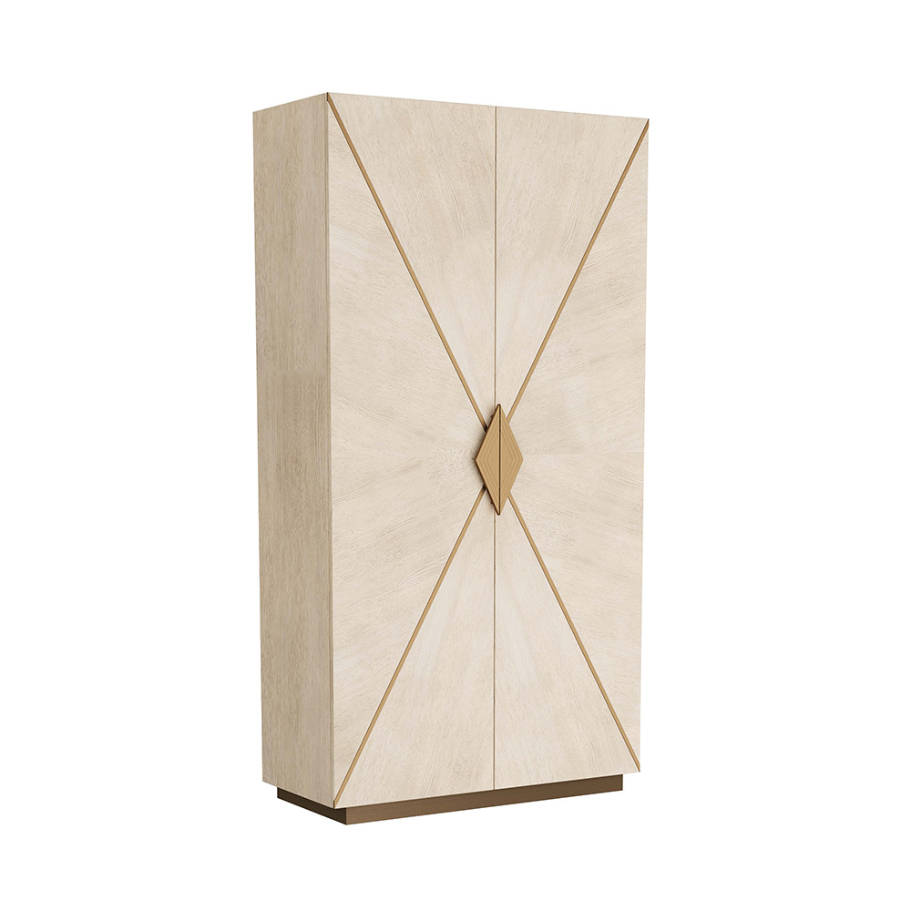 Enjoy the Tidwell Cabinet in your home today! Our large-scale Tidwell cabinet is both graphic and elegant, existing harmoniously with traditional and contemporary environments alike. Crafted in smoke oak veneer in a radial pattern, the tall storage piece features antique-brass iron inlays, which form a strong geometric point to highlight textured, diamond-shaped hardware, also in an antique brass finish. The cabinets interior is fitted with adjustable shelving and a drawer with matching hardware. Finish will vary.