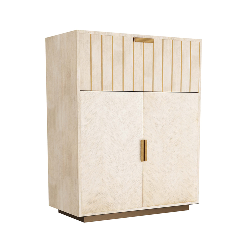 Enjoy the Upton Cocktail Cabinet in your home today! Our architectural-inspired Upton cabinet serves up cocktails with a stylish edge. Created in a chevron-patterned, smoke oak veneer, the piece is accented with vintage-brass iron hardware and inlays with a crosshatch design. The bar cabinet rests on a matching iron plinth and features a hinged, fold-down prep surface and adjustable shelves. Finish will vary.