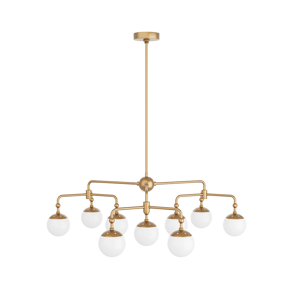 Enjoy the Utica Chandelier in your home today! With celestial inspirations, the Utica chandelier is designed with frosted glass globes that orbit the lights antique brass steel pipe frame. The eclectic fixture features round knobbed accents that punctuate the connection point of each arm. Damp-rated, although limited covered outdoor conditions may affect finish.