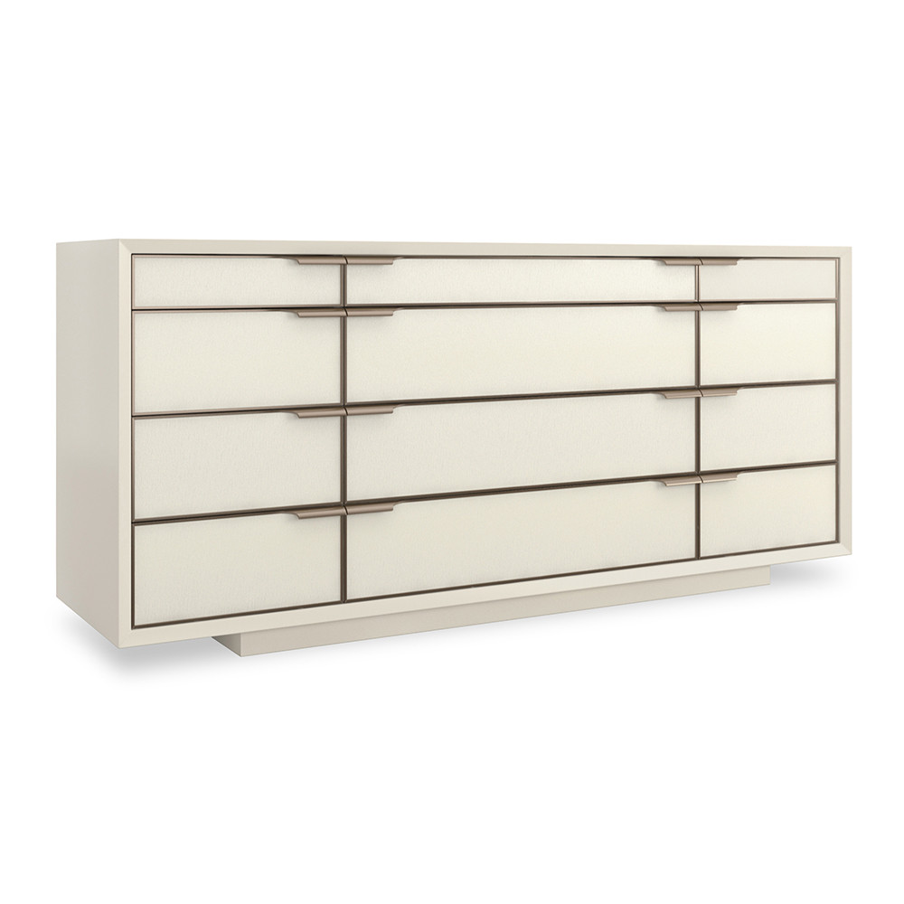 Enjoy the All Wrapped Up Dresser - Almond Milk in your home today! A lighter take on our All Wrapped Up mid-century modern dresser, this version is finished in Almond Milk on the case and plinth base. Each drawer front is wrapped in a beautifully textured vinyl with the appearance of pearlized silk. Casting a warm glow, metal drawer trim in Champagne Gold artfully incorporates soft edge pulls. This piece offers generous storage with soft-closing features and two felt-lined top drawers for an added note of luxury.