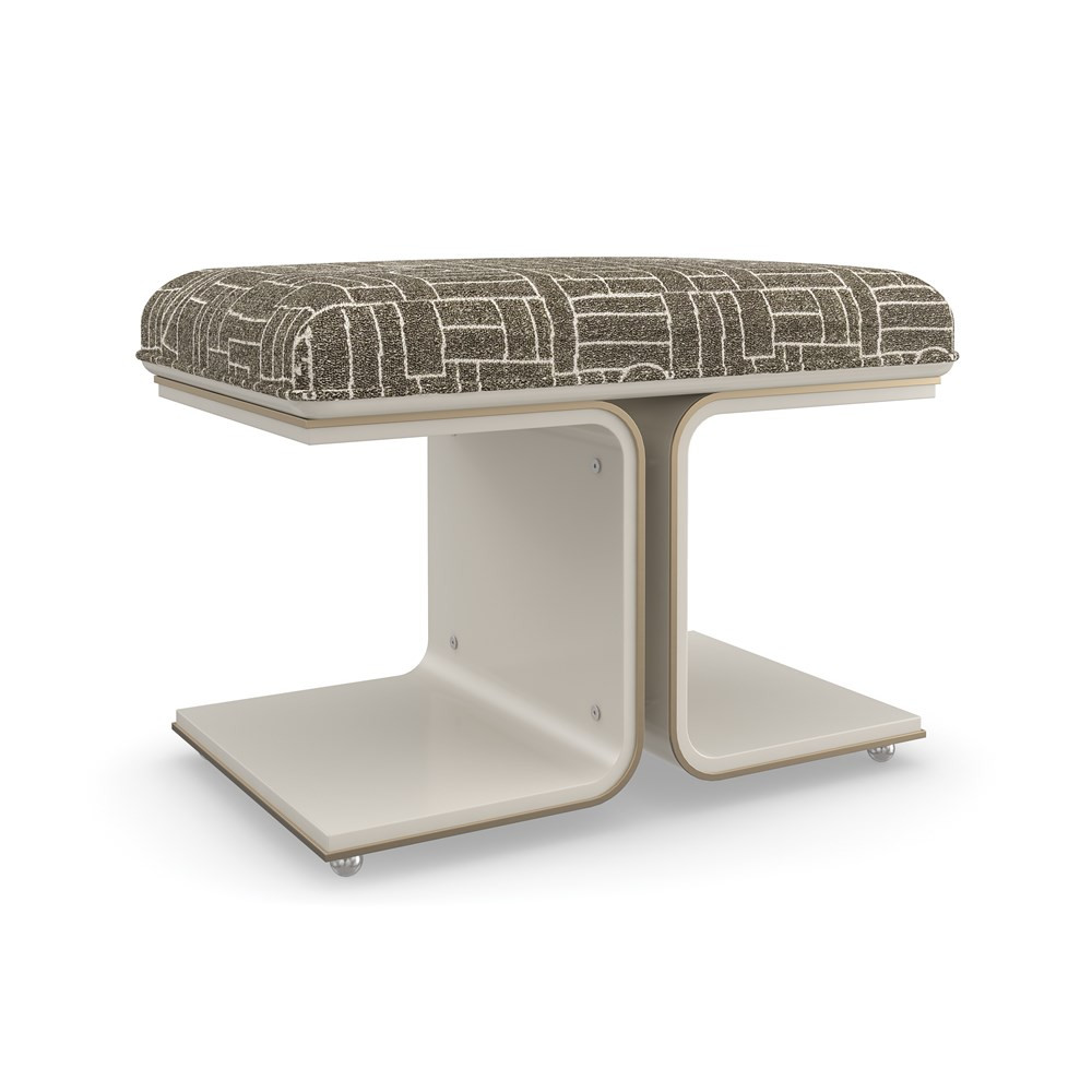 Enjoy the Balance Beam Ottoman in your home today! A nuanced study in detail and subtlety, this small ottoman introduces a sophisticated yet playful element to bedrooms and living interiors. Opposing birch bentwood frames are joined with Brushed Stainless hardware, intentionally exposed for an industrial touch. Brushed Gold metal trim and Brushed Stainless ball feet finish the look, elevated by its Cubist-inspired fabric cushion in a moss-green colorway. Style in pairs to create a chic end-of-bed bench.
