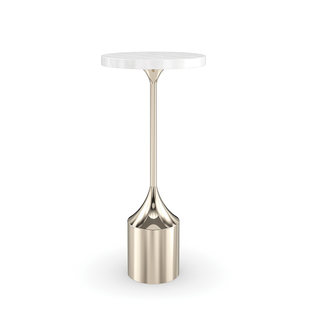 Enjoy the Beta Side Table in your home today! A nod to the streamlined style of a mid century candlestick, this spot table is well-scaled for reading nooks and larger spaces designed for entertaining. Its white stone top lends soft contrast to a sculptural metal frame with a sturdy base in a Whisper of Gold. Designed to pair with our Alpha and Gamma accent tables to create composition, or style solo for ease of use and convenience.