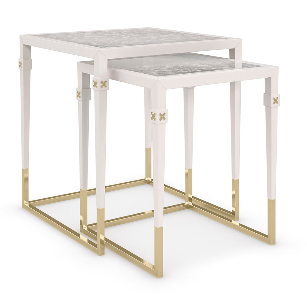 Enjoy the Better Together Table in your home today! Refined and reflective, this sleek pair of nesting tables artfully mixes materials and finishes for an exquisite balance of form and function. Antique mirrored glass tops add a note of vintage glamour to a Pearly White frame and legs with Majestic Gold ferrules and stretchers. For added adornment, a gold metal X inlay finishes the look with an element of distinction. Sold as a nesting pair.