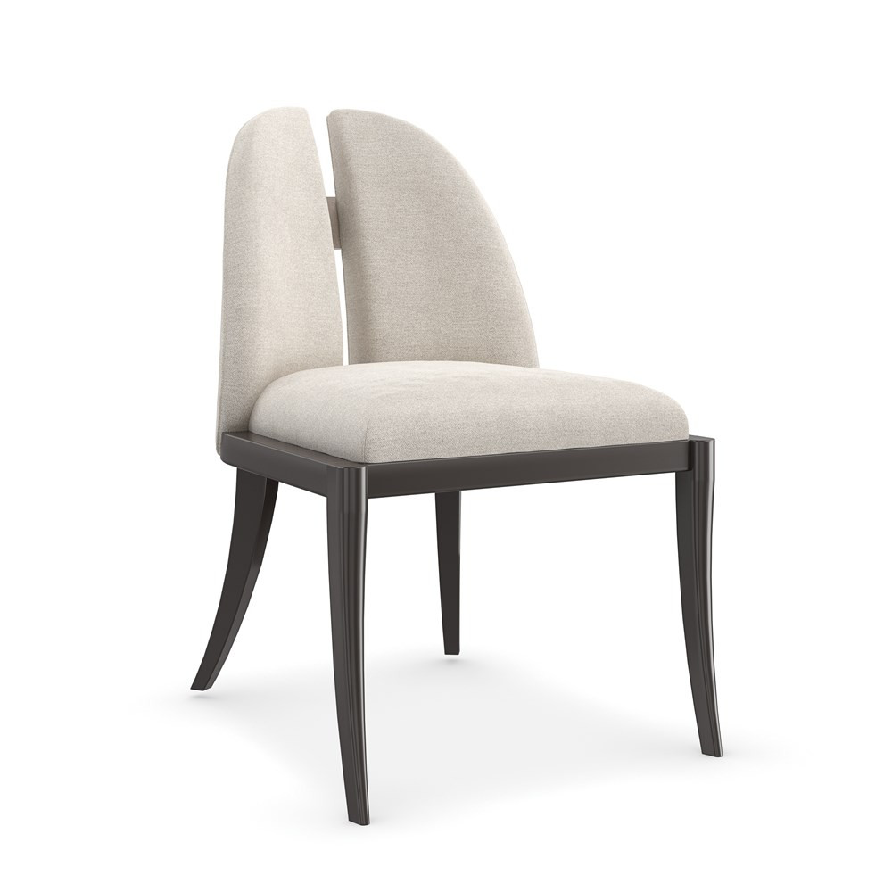 Enjoy the Cameo Dining Chair in your home today! A sublime reflection of familiar forms, this dining chair depicts the delicate balance between subtlety and strength. Its delicate silhouette features a softly curved, split back, joined at the middle with a textured metal accent in lightly brushed chrome. Airy and light, with a substantial presence, it offers casual comfort with an air of elegance.