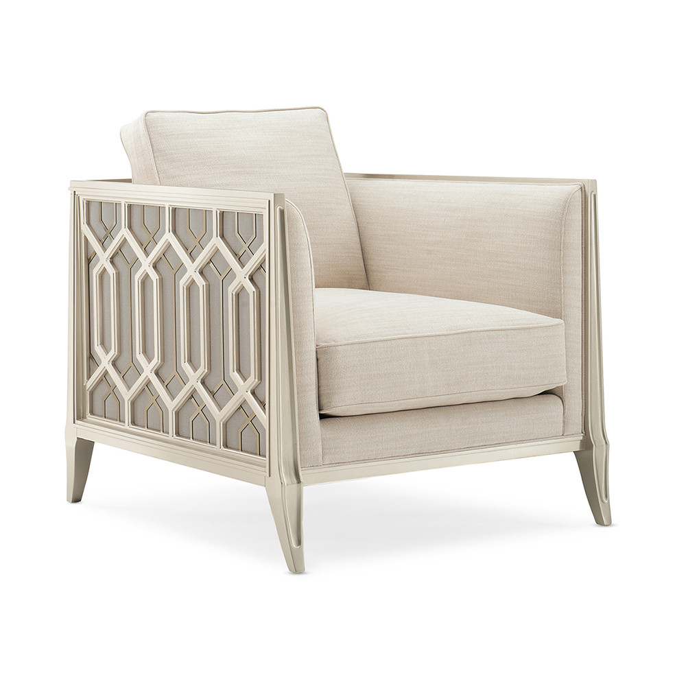 Caracole offers an exclusive and creative collection of distinctive pieces for every room of the home, all designed in the USA. Sophisticated, polished and inspired, it's a highly edited portfolio of pieces defined by exceptional style that is infinitely adaptable and ultimately unique. At Caracole, our attitude on design is taking a fresh new perspective. Each item is designed to stand alone or mix together, whatever speaks to your creative soul. Feel free to unleash your inner artistic spirit and disregard old rules that a specific piece must reside in a precise room.Enjoy the Just Duet Chair in your home today! On a balcony railing of a former palace converted to a hotel in India is a carved pattern that was the muse for the pierced design found on this chairs outer arms. The idea of layering metal fretwork behind the wood was inspired by the dual shadow cast on the balcony by the setting sun through the railing's design. Creating a high-fashion look unique to itself, these elements are highlighted with illuminating shades of Soft Silver Paint and Champagne Gold and an exquisite cover.