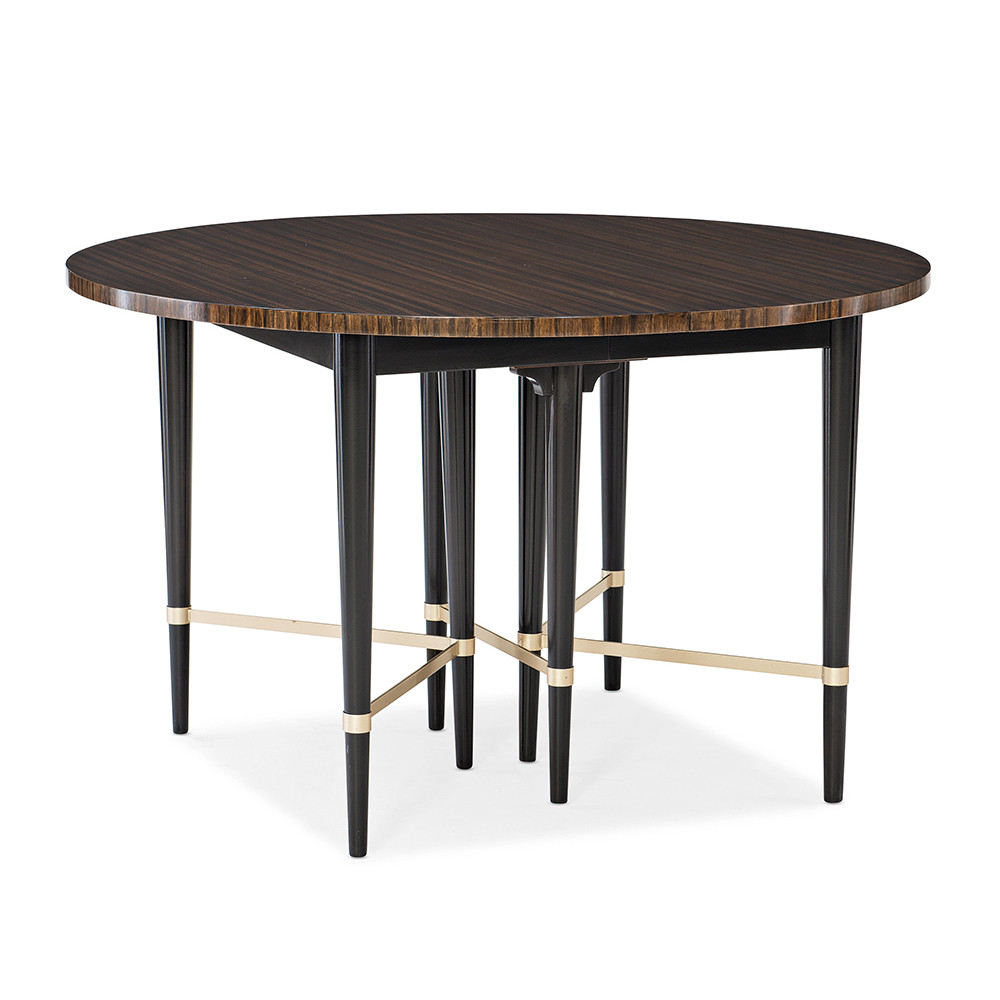Enjoy the Just Short Of It Dining Table in your home today! Set a stylish scene with the bold character of this statement-making dining table. Its perfect proportions offer urban scaling in a contemporized traditional design. Stunning quartered Paldao wood distinguishes the tabletop and is finished in a rich shade of Saddle. A deep Black Saddle finish adds depth to its legs and apron while a Neutral Metallic highlights the stretchers. Its 48-inch design is easily extended to 72 inches with its 24-inch leaf so you can accommodate even more guests.