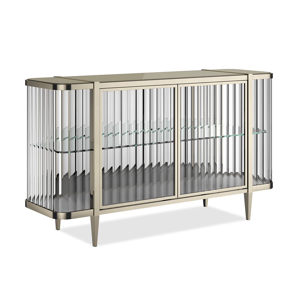 Enjoy the Stop And Stare Sideboard - Whisper Of Gold in your home today! Its true, this console is so extraordinary, you cant help but Stop And Stare. Its an instant source of brightness and reflectivity that creates a natural focal point. A wavy acrylic exterior mirrors the undulating patterns of sand and sea while its top adds another layer of organic splendor. The mirrored interior back and bottom panels are designed to reflect light as it pours in from every angle as well as mirror the beauty of the treasures you display. Glass shelves ensure unobstructed views as do its touch-latch doors with concealed hinges. A Whisper of Gold finish outlines its rounded silhouette and four tapered feet, imparting the overall luxe feeling of a diamond in a platinum setting.