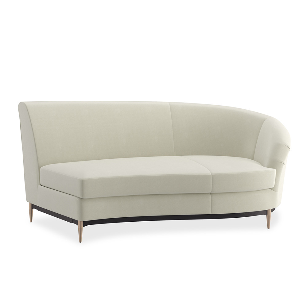 Enjoy the Three'S Company RAF Sofa - Cream in your home today! This regal sectional makes a dramatic showpiece that emanates glamour. Upholstered in velvet, its curved profile is complemented by sumptuous comfort. Reflecting the gracious elegance of the Hollywood Regency era, it features a shapely back button-tufted with vertical, cuff link-inspired gold metal bars. Its lower edge and outer arms are trimmed in Almost Black while its metal tapered feet are finished in Champagne Gold. Artful from edge to edge, this statement piece creates drama wherever it goes.
