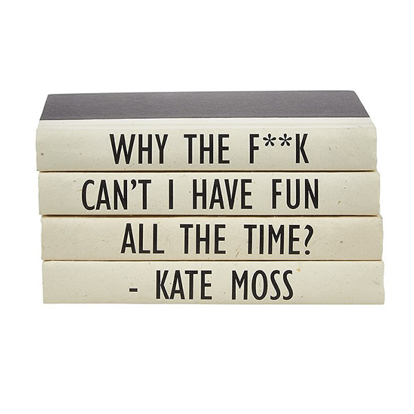Enjoy the E Lawrence 4 Vol Kate Moss Quote - "Why The F**K Can'T I Have Fun All The Time" in your home today! 4 volume quote stack, "why the f**k can't I have fun all the time" 9.5" wide, 5.33" tall black covers