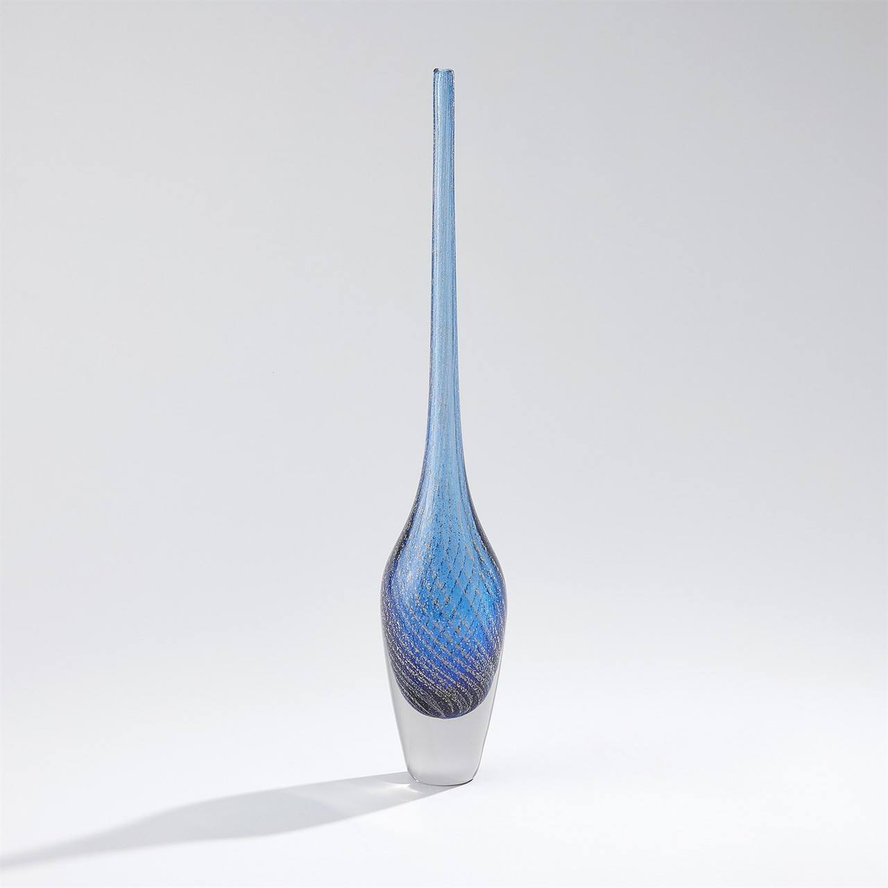 Enjoy the Flecked Spire Bottle - Blue - Lg in your home today! Crafted with meticulous attention to detail, our Flecked Spire Bottles are handblown and mold-formed using a glassblowing technique that combines clear and blue glass with striking gold flecks. Each unique piece showcases a captivating interplay of color and light, making it a stunning addition to any décor.