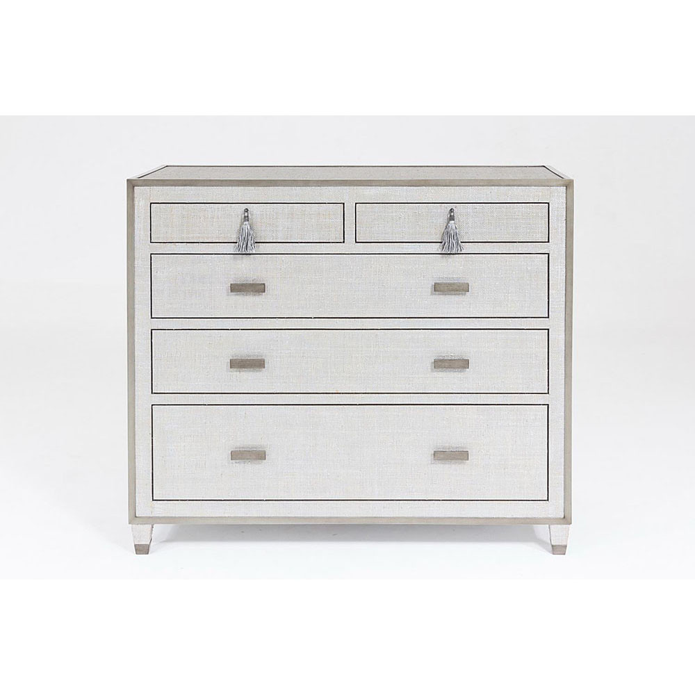 Enjoy the Glass for Ann Gish Chest of Drawers in your home today! The Argento collection is inspired by finely textured, intricate Florentine silverwork, mixing soft shine and modern silhouettes. Each piece mixes silvered raffia coverings with pewter metal trim. Mixing function and aesthetics, this chest is perfect for storage and top two drawers of this are lined. Generous but not oversized, this bit of modern gilding is tailored but also opulent.