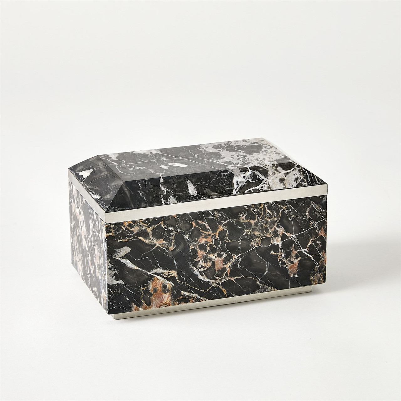 Enjoy the Golden Portoro Box - Sm in your home today! The Golden Portoro Boxes, with their sleek and sophisticated design, feature Portoro marble sourced from the northern region of Italy. This exquisite and luxurious natural stone is renowned for its captivating black backdrop and stunning golden veining. Complemented by polished stainless steel accents, it radiates a modern and elevated aesthetic. As marble is a natural product, please be aware that there will always be variations in veining and color. This is to be expected and makes every marble product uniquely your own.