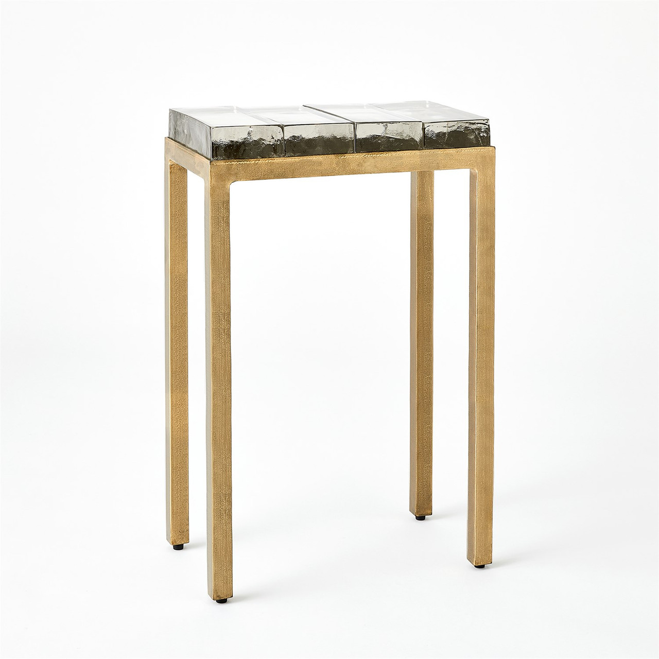 Enjoy the Ice Block Table - Quad - Antique Gold in your home today! The Ice Block Tables are handcrafted from iron with an antique gold finish and adorned with clear cast glass surfaces. Small bubbles may occur naturally due to the thickness of the cast glass making each piece individually unique.