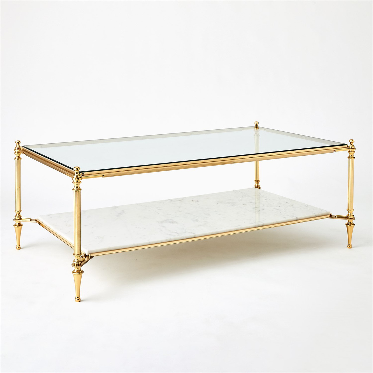 Enjoy the Medford Cocktail Table - Brass in your home today! The Medford Tables feature a two-tiered design with luxurious white marble and tempered glass in a polished brass frame perfect for both entertainment and storage.
