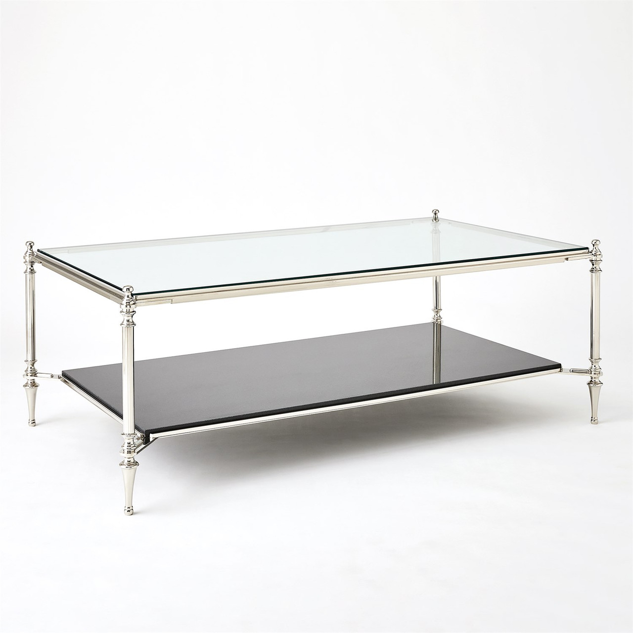 Enjoy the Medford Cocktail Table - Nickel in your home today! The Medford Tables showcase a two-tiered design, combining luxurious black granite and tempered glass within a brass and iron frame adorned with a shiny nickel finish. They are ideal for both entertainment and storage needs.
