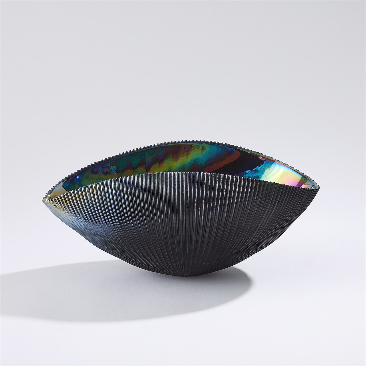 Enjoy the Pleated Bowl - Black - Med in your home today! The Pleated Bowls are beautiful handmade art glass from the Murano region. This manufacturer invented the centrifuge machine and technique that spins molten glass into discs that are then manipulated by hand into various organic shapes. During the process, varying colors and finishes are applied to the glass. While still warm, the pieces are put through an annealing process in a tunnel oven to cool slowly so as not to explode. The annealing process can take anywhere from hours to many days depending on the thickness of the glass. Annealing is a process of slowly cooling glass to relieve internal stresses after it is formed. The process may be carried out in a temperature-controlled kiln known as a Lehr. Glass that has not been annealed is liable to crack or shatter when subjected to a relatively small temperature change or mechanical shock. Annealing glass is critical to its durability.