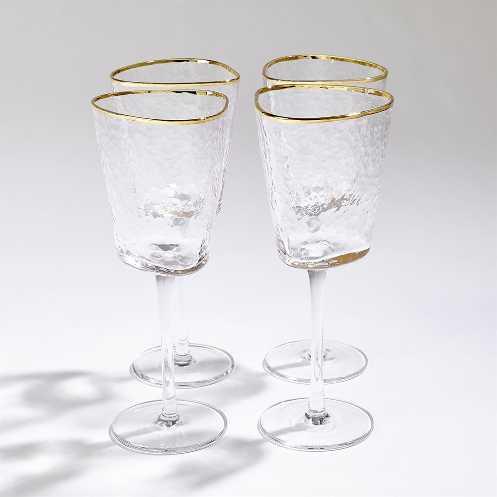 Enjoy the S/4 Hammered Wine Glasses - Clear W/Gold Rim in your home today! Mouth blown glass with hammered texture and handpainted gold rim.