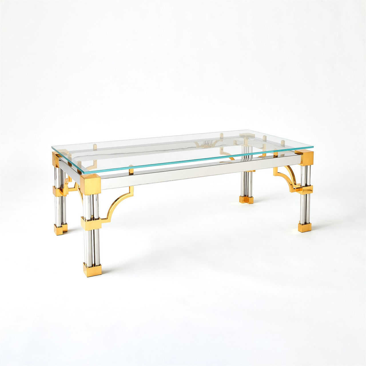 Enjoy the Tri - Column Cocktail Table in your home today! The Tri-Column Collection is a tribute to the historical windows of Venice, featuring quatrefoil design accents that exude sophistication. Crafted from brass with a gleaming shiny brass finish, stainless steel with a nickel-plated finish, and topped with tempered glass, these tables are an exquisite blend of artistry and functionality.