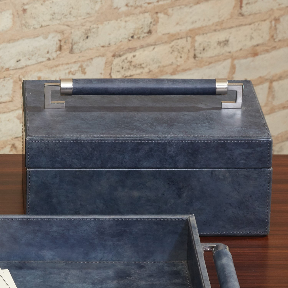 Enjoy the Wrapped Leather Handle Box - Blue Wash in your home today! Wrapped Leather Handle box is constructed of hand stained washed blue leather lined in suede cloth.