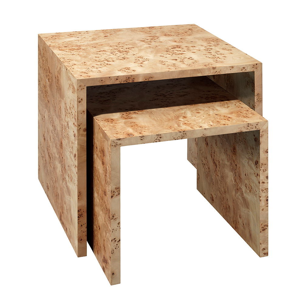 Enjoy the Jamie Young Bedford Wood Set Of 2 Nesting Tables - Natural in your home today! The clean, classic lines of this set of tables make for a versatile statement to any room. The burnished beauty of its burl wood veneer frame reveals one-of-a-kind variations in tone and pattern, while the open frame allows the use of baskets and other storage underneath. Ideal for multi-use rooms, the nesting design expands surface space when needed, then swiftly tucks in when not in use.