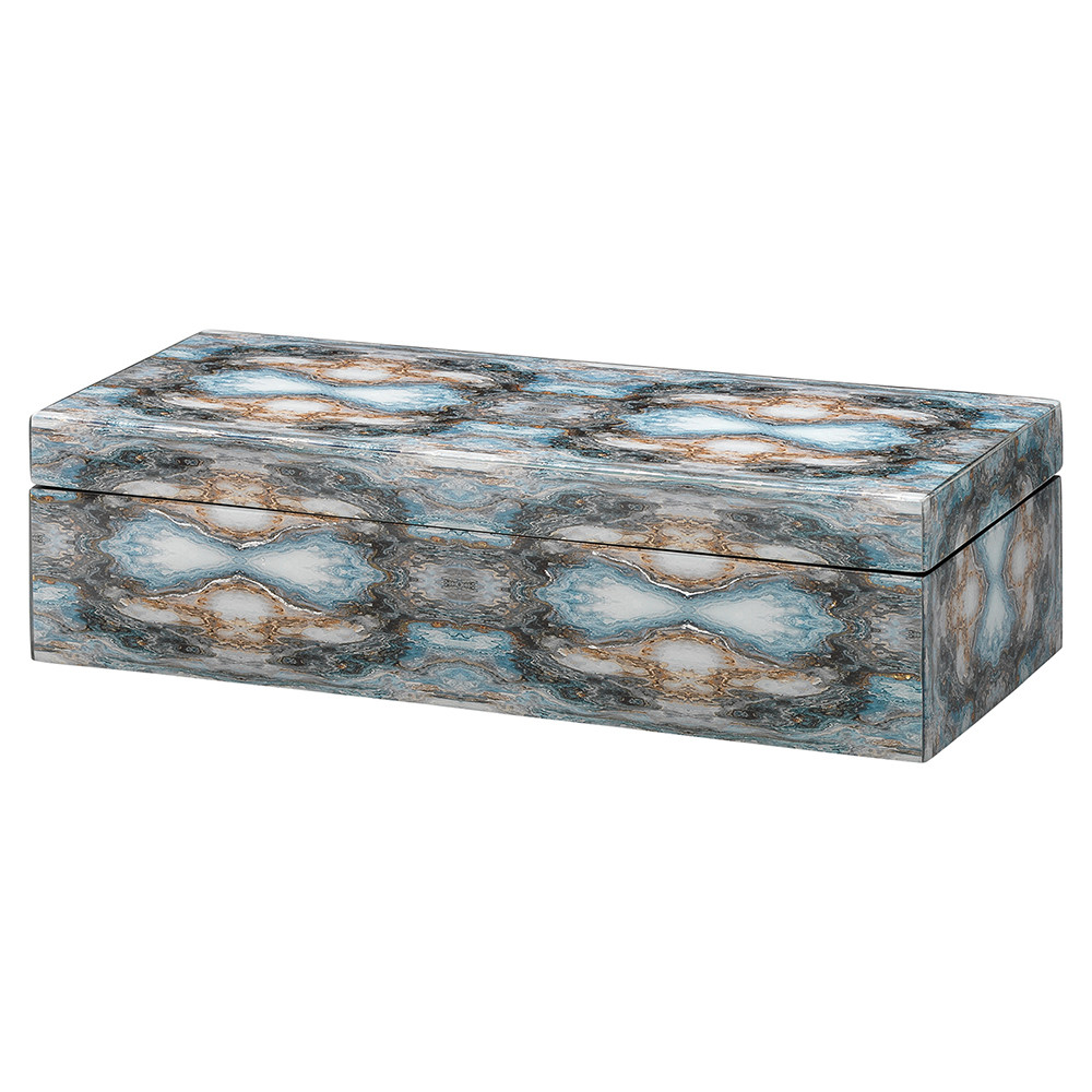 Enjoy the Jamie Young Rorschach Long Box in your home today! Inspired by Rorschach inkblots tests, known to examine emotion through interpretation, our Rorschach Long box inspires you to look closer into the bold tones of indigo, navy and cream, accented with silver and gold leaf. These components create dynamic patterns through overlaid photos underneath a clear lacquer.