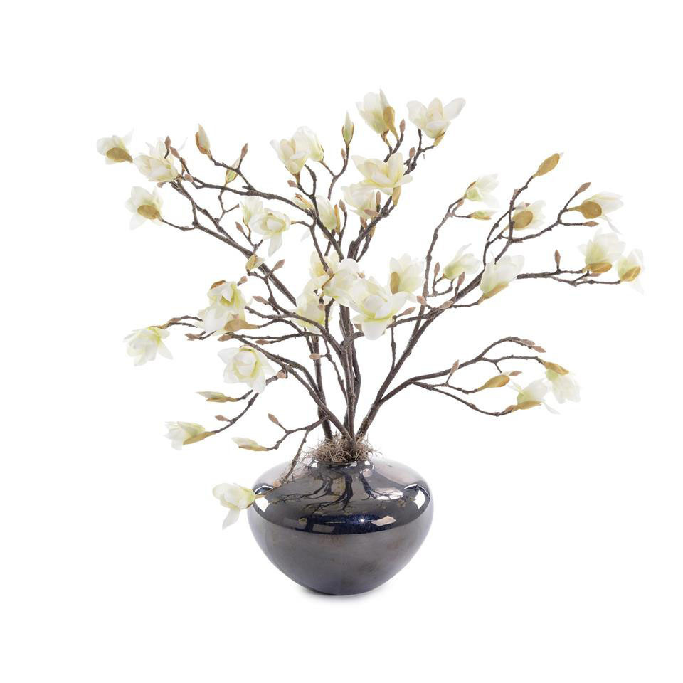 Enjoy the Asian Delight in your home today! Japanese magnolia branches with natural reindeer moss are featured in a slate grey vase with a gloss finish.