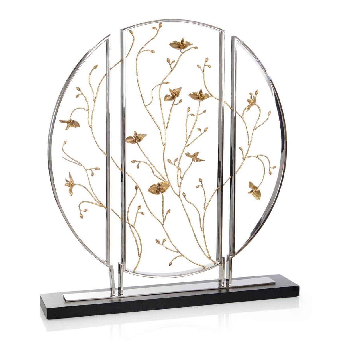 Enjoy the Circle Of Life Sculpture in your home today! The Circle of Life Sculpture is an innovative marriage between natural inspiration and modern design. The polished stainless steel frame is mounted on a rectangular base of black iron and divided into three parts, imbuing the piece with an eye-catching dimensional element. At the center of the sculpture, gorgeous flora in polished brass stretches out in all directions, piercing the borders of the frame. This stunning statement piece facilitates a calm, peaceful atmosphere in an interior space that will seamlessly blend in with a wide variety of design styles.