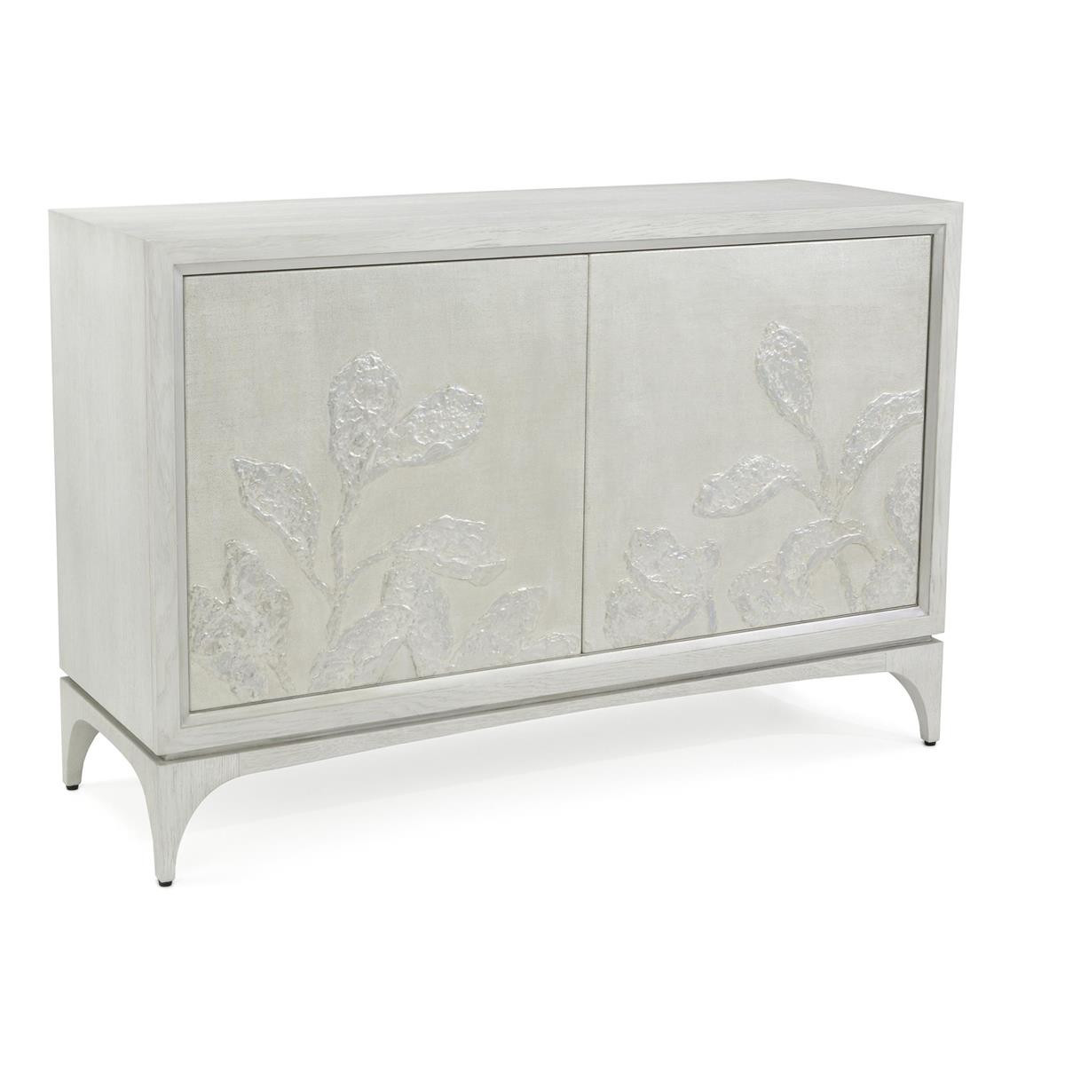 Enjoy the Cressida Chest With Doors in your home today! The Cressida Two-Door Chest features a modern interpretation of embossed leaves in washed silver bringing them to life in full vibrancy. The case is wrapped in oak finished in our Carrera white. The doors are completed with push latches and European hinges.