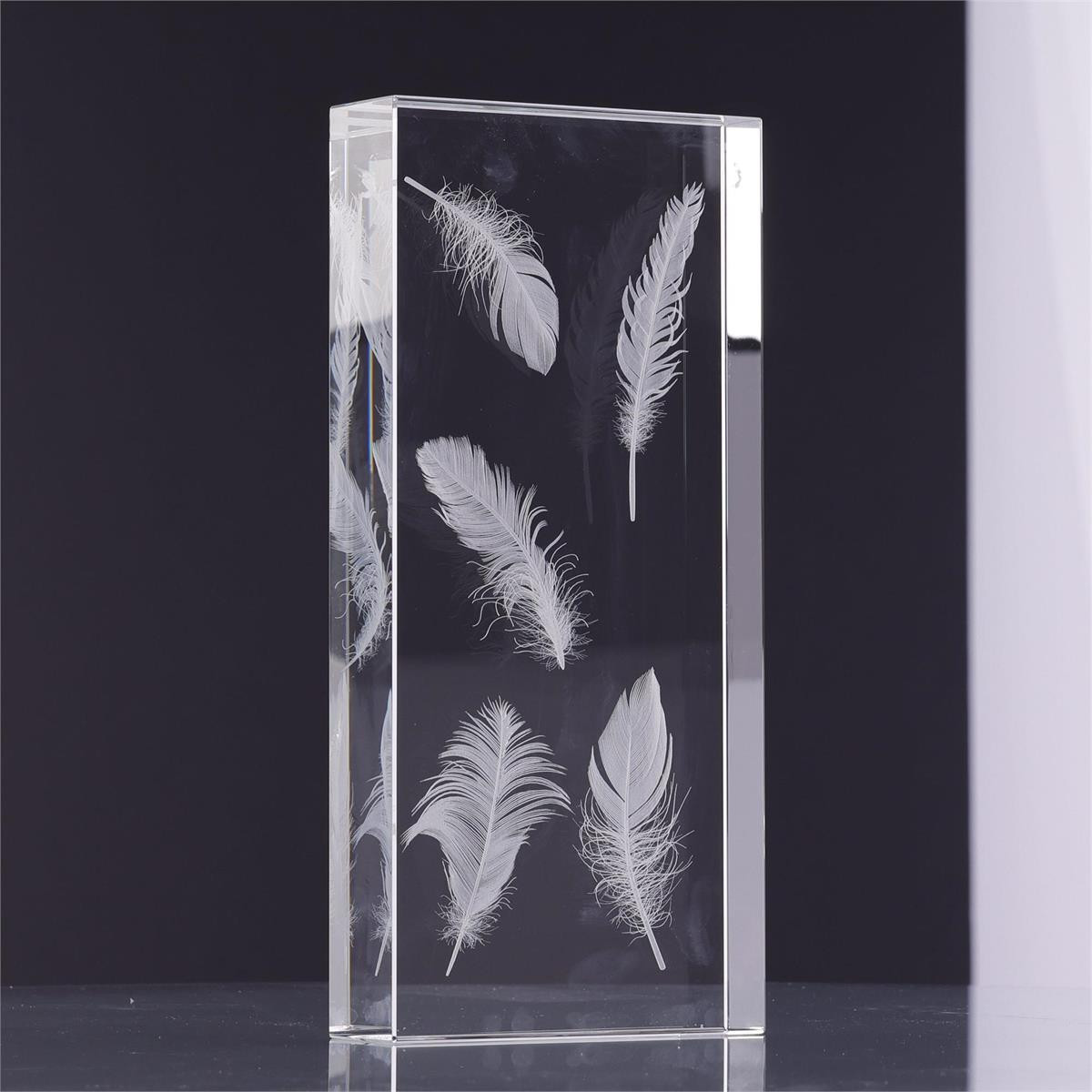 Enjoy the Crystal-Encased Feathers in your home today! This stunning decorative accent displays five gorgeous white feathers suspended within a rectangular cut of clear crystal.