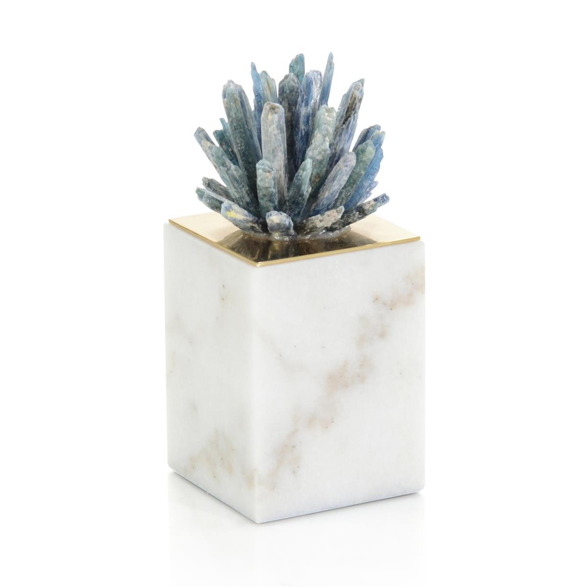Enjoy the Cyanite Starburst On Marble Sculpture I in your home today! This stunning sculpture features a gorgeous formation of natural cyanite crystals that merge into a starburst pattern. The piece is gently perched atop a square base of white marble separated by a thin plate of polished brass, creating a lovely juxtaposition between shiny metallics and rugged stone. Possessing a wealth of dynamic texture, the Cyanite Starburst on Marble Sculpture is a wonderful accent piece to elevate the look and feel of an interior space. A fantastic addition to any décor, the piece can also be placed alongside its two alternate variants to further enhance the look. *Marble is a naturally occurring stone mined for its beauty in various regions of the world. The chemical and mineral composition of the marble from the locale it is found, creates the vast array of color and pattern variations seen in this classic decorat