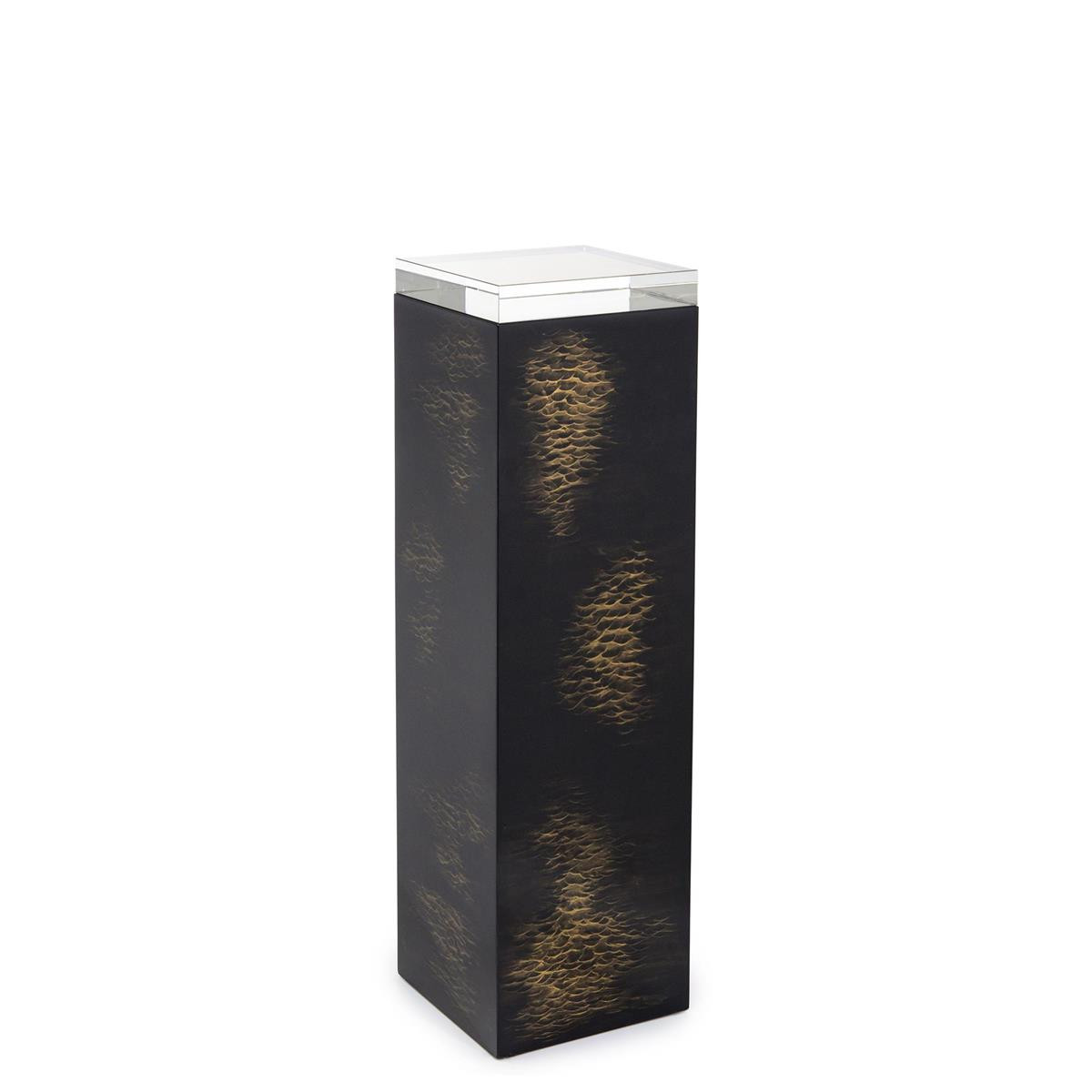 Enjoy the Draco Pedestal Iii in your home today! The Draco Pedestal features a classic rectangular profile that is elevated by a debonair black lacquered finish. Across the black exterior, a plethora of golden scales adorn the body, imbuing the piece with unforgettable personality and establishing stunning visual interest. Perched atop the Draco Pedestal is a squared surface of clear crystal, providing stunning juxtaposition to the black and gold hues, completing the look. A gorgeous piece by itself, this pedestal can be arranged alongside its multiple variants to result in creative custom arrangements.