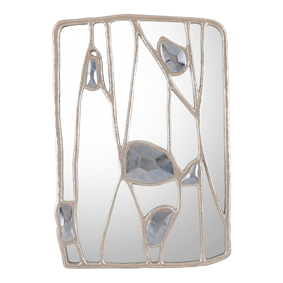Enjoy the Embellished Branches Mirror - Silver in your home today! The Embellished Branches Mirror showcases an innovative blend of organic shapes to create a unique, contemporary design statement. Crafted from aluminum in a Nickel finish, the mirror features an asymmetric shape with organic branches overlaying the mirrored glass. Along these silver branches are enameled glass embellishments with the appearance of natural quartz crystals. This stunning mirror is affixed with French cleat hangers and is meant to be displayed in a vertical orientation.
