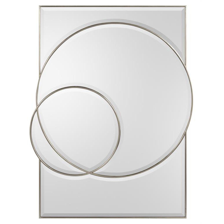 Enjoy the Equinox Mirror in Pewter Silver in your home today! In the form of a partial eclipse, two intersecting circles are framed with delicate cockbead moldings extending past the main rectangular frame. All panes are modern beveled mirror, and the frames are finished in pewter silver. This mirror is designed for portrait or landscape orientation.