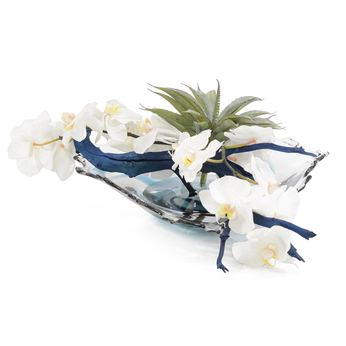 Enjoy the Evening In Paris in your home today! Beautiful Blue crystal bowl with white real touch phalaenopsis orchids, succulents and natural blue tinted manzanita.