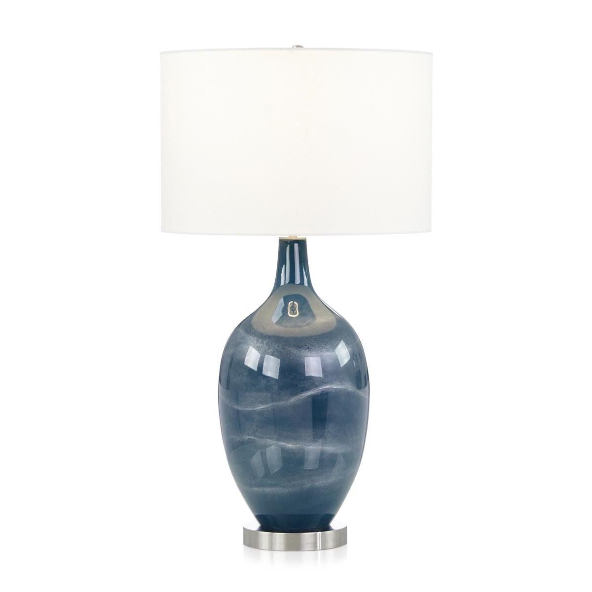 Enjoy the Eventide Table Lamp in your home today! A deep, romantic shade of blue permeates the body of the Eventide Table Lamp. Peeking out from beneath the dark hues are faint, wispy streaks of white that reminisce of a cool breeze flowing in the night. The piece is finished with a soft glossy sheen, accentuating the curvaceous body and beautifully complementing the circular base of brushed stainless steel with and matching finial. The dark blues and silvery accents of this alluring table lamp will become a staple in an interior space, gracefully fostering an atmosphere of artistry and sophistication. *This item features acrylic parts. The crystal clear acrylic that John-Richard uses on some items is a wonderful decorative material. Over time, very fine scratch marks may appear on the surface of the acrylic through normal dusting and clea