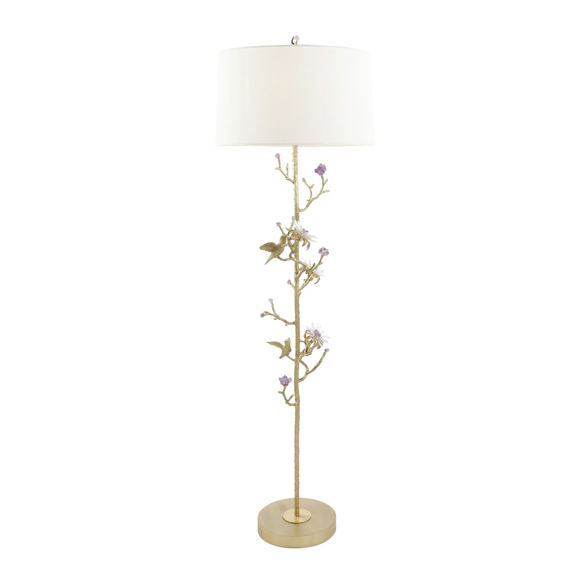 Enjoy the Gemstone Garden Floor Lamp in your home today! The Gemstone Garden Floor Lamp represents a stunning marriage of natural motifs and chic modern design. Crafted from brass in a Honey finish, the piece takes the form of an opulent sapling dotted with crystalline flowers of selenite and amethyst. Two small birds can also be perched atop the branches, recreated with intricate detail. This three-way turnkey lamp features a round marble base and an organic finial embellished with an amethyst crystal.