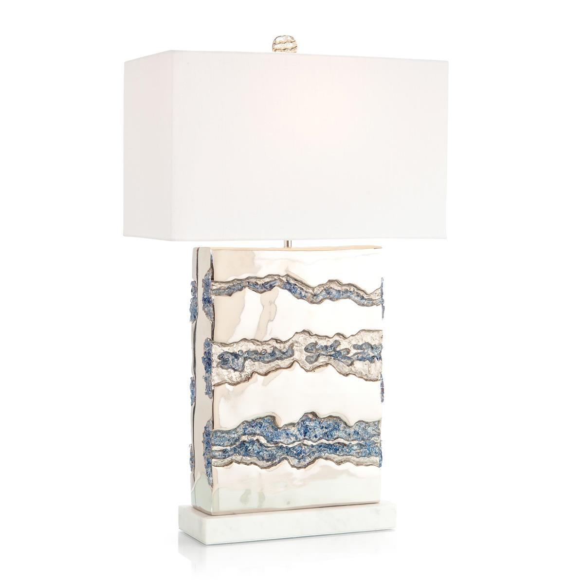 Enjoy the Glass Geode Table Lamp - Deep Blue in your home today! A table lamp features deep blue glass geodes inlaid in a polished nickel-plated chasm for the lamp body atop a white marble base. *WITH HAND-MADE METAL PRODUCTS, slight imperfections may occur due to the artisanal finishing, shaping, carving, and welding techniques used by master craftsmen. No two will be identical.