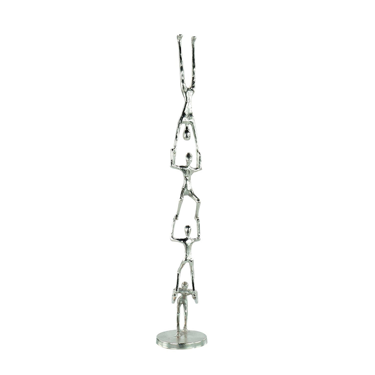Enjoy the Gymnast Tower Sculpture - Large Nickel in your home today! The Gymnast Tower Sculpture is a unique statement piece that lends a creative, artistic flair to an interior space. Crafted from aluminum in a Nickel finish, the sculpture with a rounded base depicts four gymnasts in various poses as they stack in a tower formation.