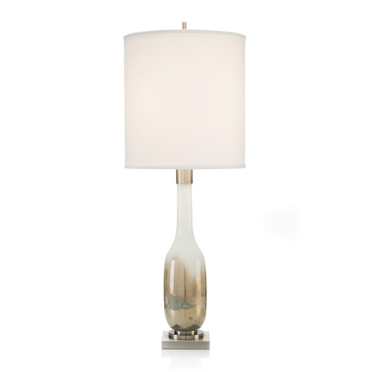 Enjoy the Handblown Golden Table Lamp in your home today! A snow-covered, golden opulence, handblown glass table lamp. Shade: 15" X 15" X 16", White outside and inside, Cotton and Man-Made Silk, Round. 3 Way, 150 Watt Max, Type A Bulb, 11" Nickel Harp