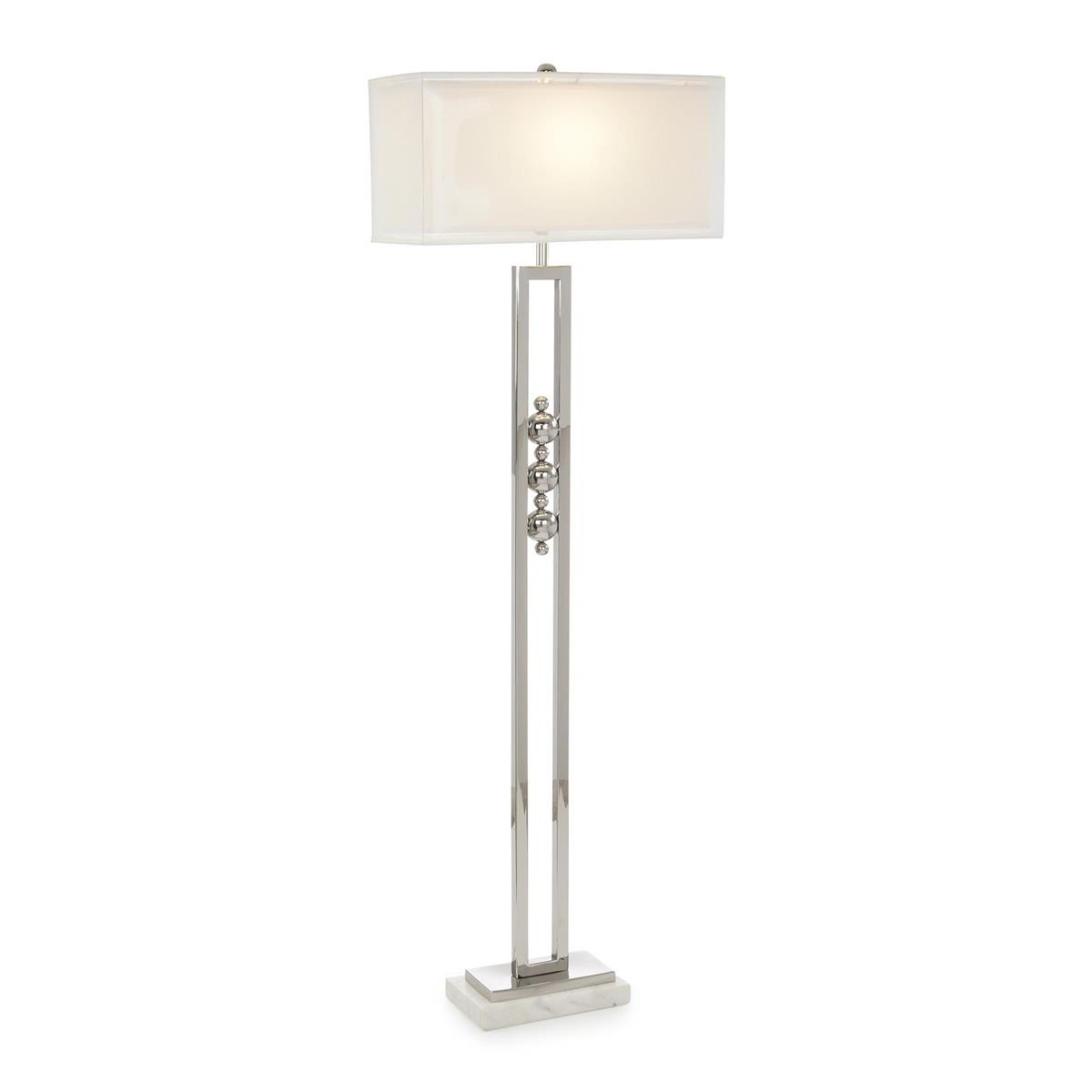 Enjoy the Isla Floor Lamp in your home today! The Isla Floor Lamp displays an exceedingly contemporary design that lends an irresistible air of gravitas to an interior space. The frame features a rectangular body of steel, with an arrangement of lustrous orbs suspended in the center. With a gorgeous polished nickel finish, the body extends downwards onto a rectangular steel base with a larger slab of white marble beneath it. A rounded finial, also in polished nickel, completes the look of this beautiful turnkey lamp.