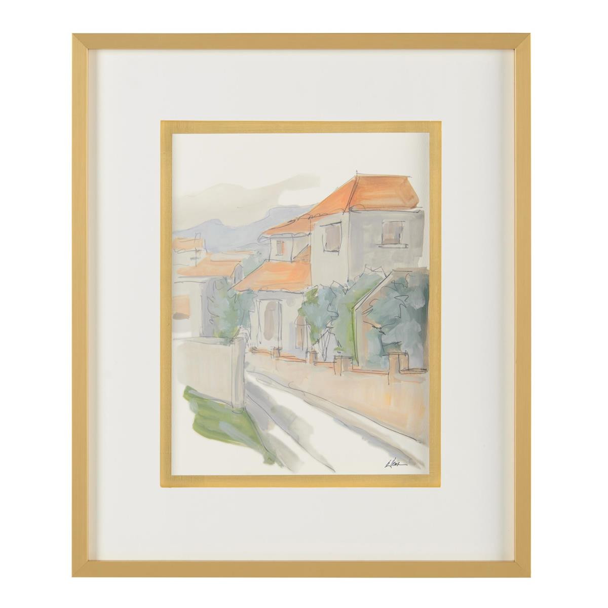 Enjoy the Jackie Ellens' Street Scene Iii in your home today! Jackie Ellens Street Scene is reproduced on watercolor paper. Mounted on a gold leaf background. A Hand painted top surrounds the overall design. Framed in a narrow gallery molding with a gold finish.